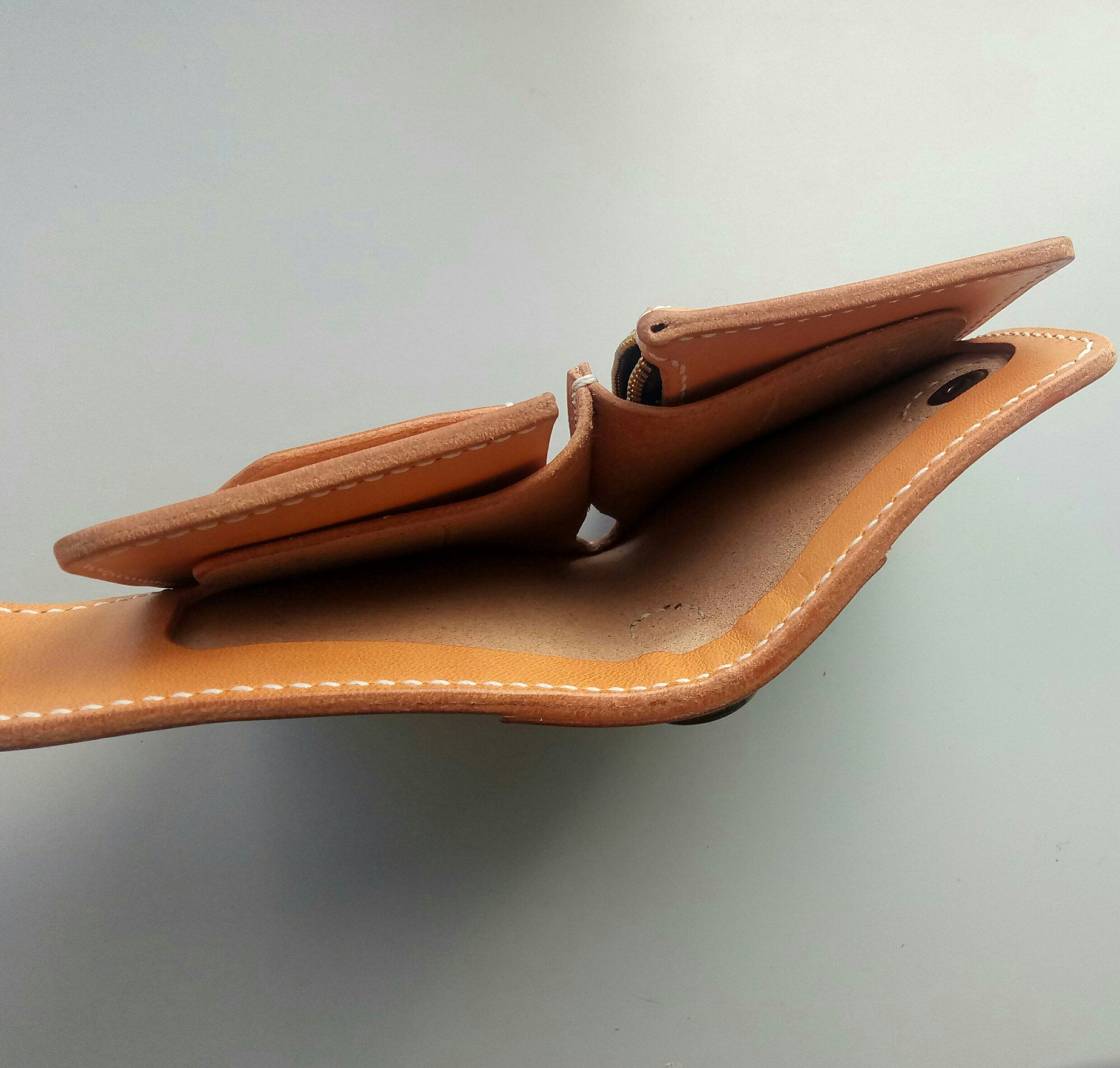 The wallet has 2 compartments for cards, one hidden compartment, one large compartment for banknotes and a compartment for coins with a zipper.