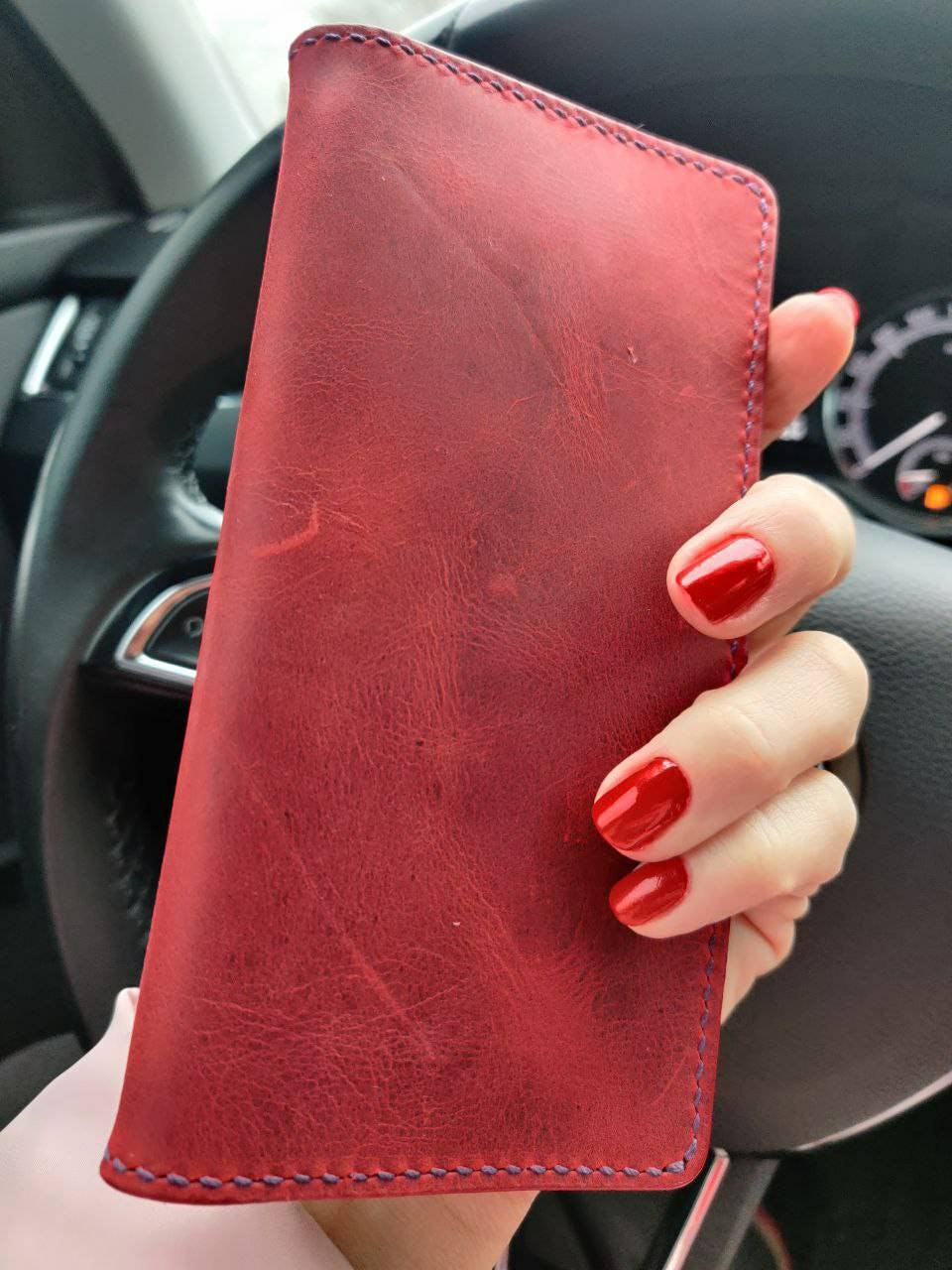 The wallet is made of real distressed Italian-made red leather premium quality. The thickness of the leather is 1.6mm, it is soft and pleasant to the touch, but quite dense.