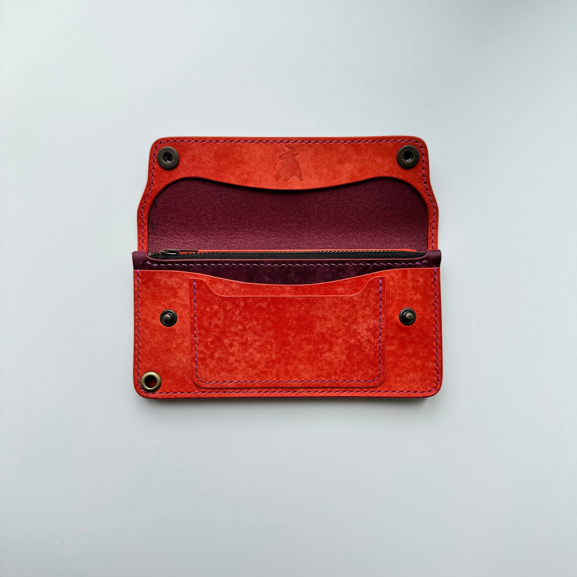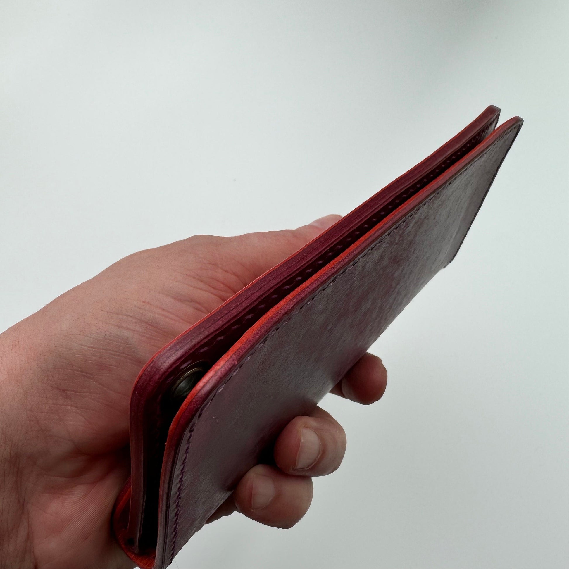 The wallet is made of real vegetable tanned Italian-made red and violet leather. The thickness of the leather is 1.4mm, it is thin, but very dense.
