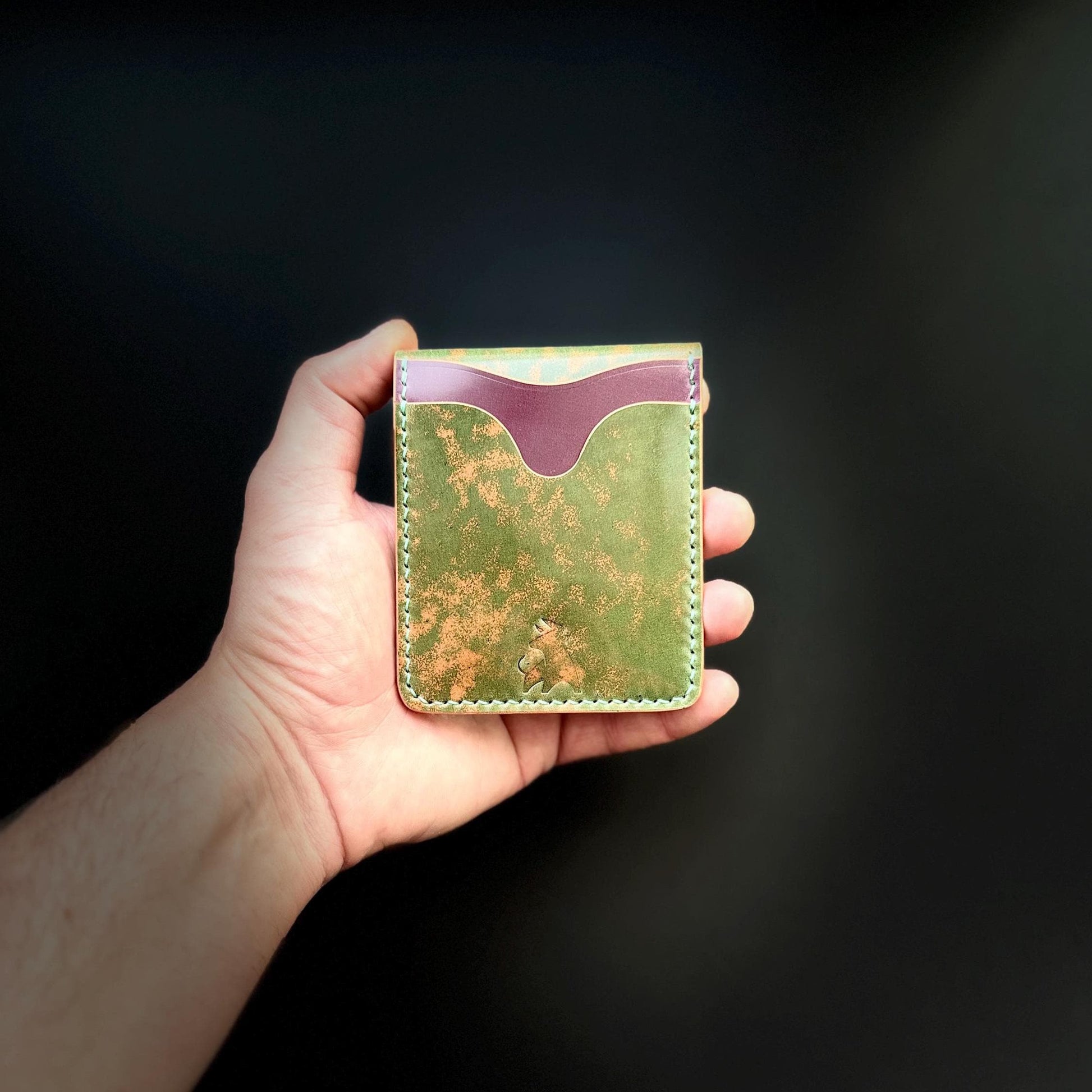 A striking contrast of deep solid purple and vibrant marbled green makes each piece truly one of a kind. Inside, there’s a spacious compartment for your bills (fits banknotes once folded), along with a secure inner card slot. On the outside back panel, two quick-access card pockets add both function and flair.