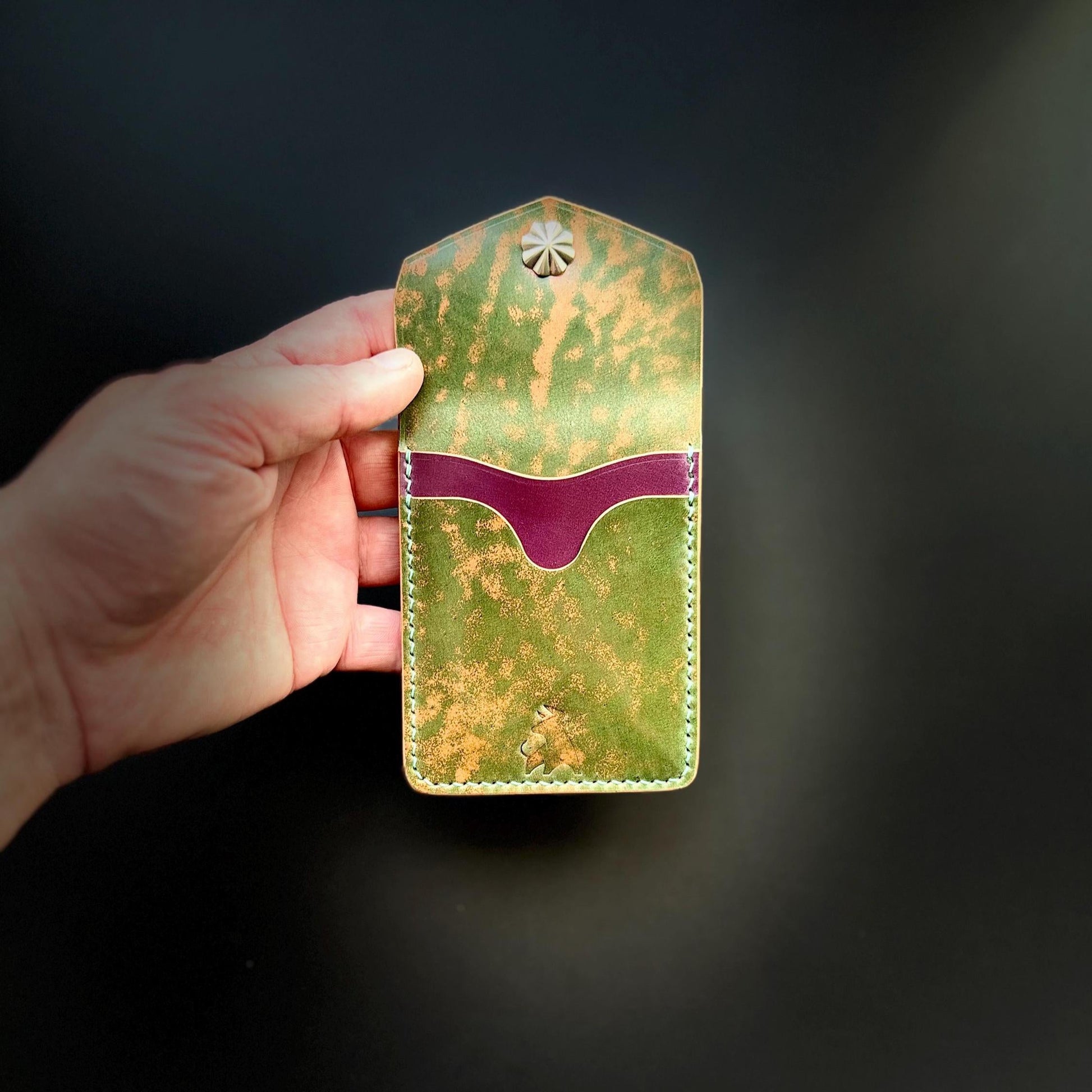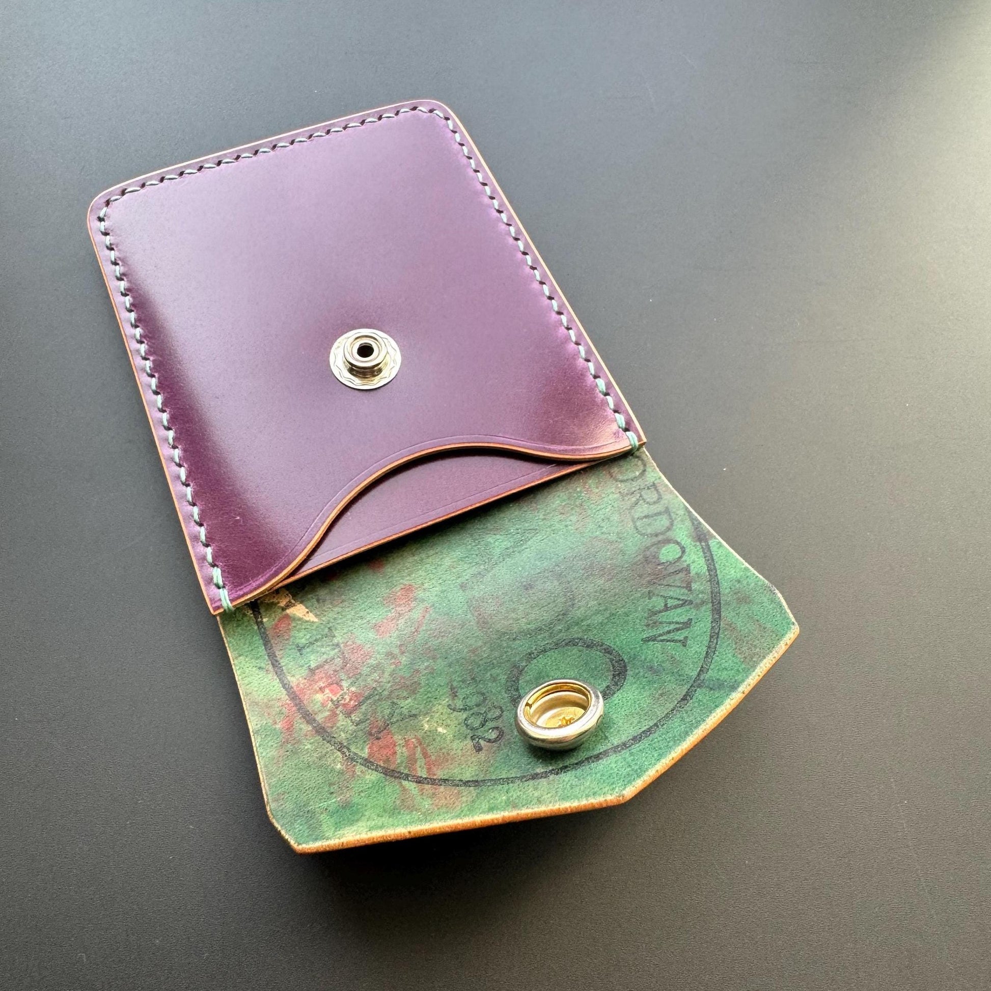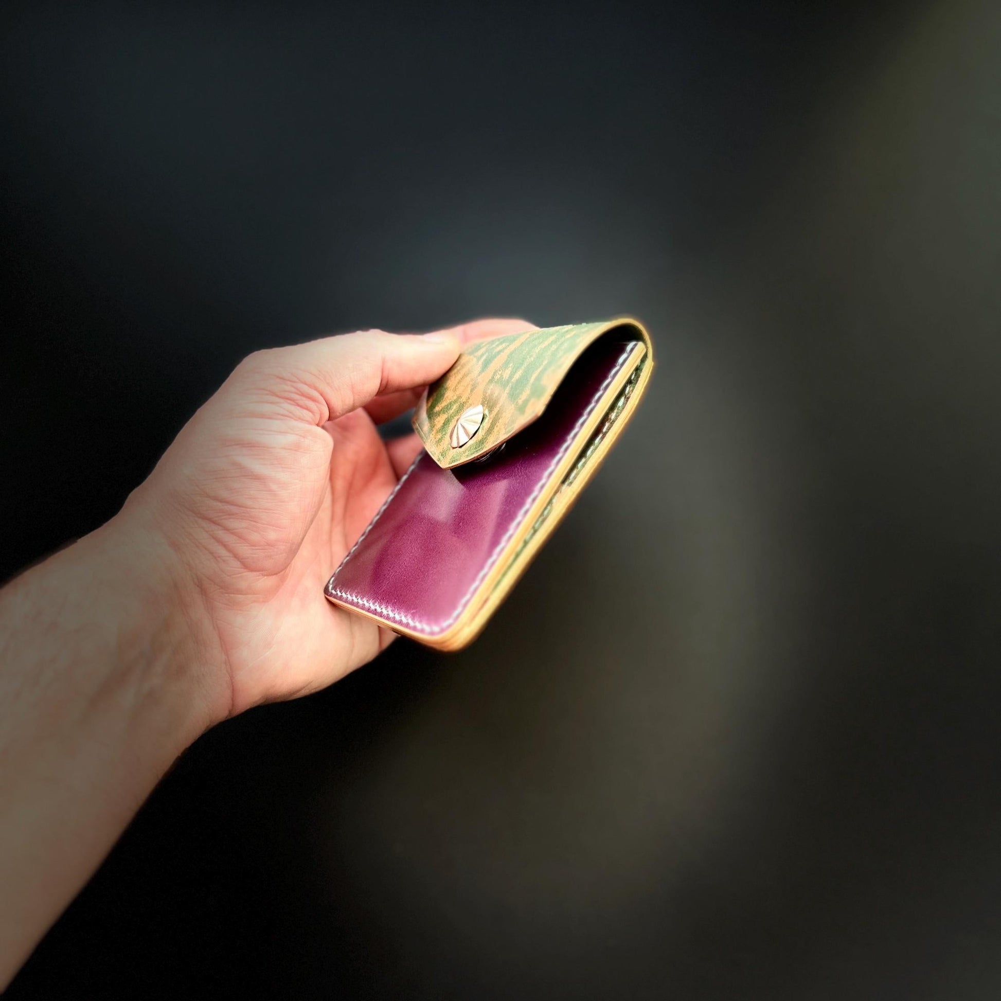 Handmade EDC slim wallet crafted from premium Rocado Shell Cordovan, featuring a concho snap and compact size for front pocket carry.