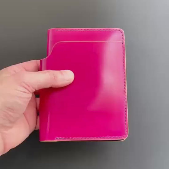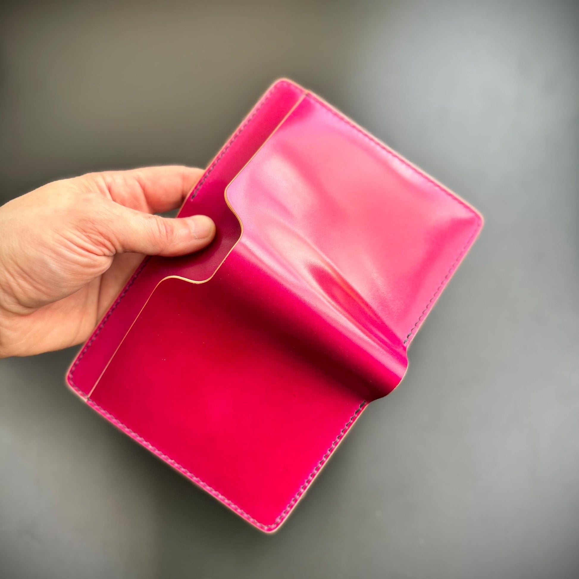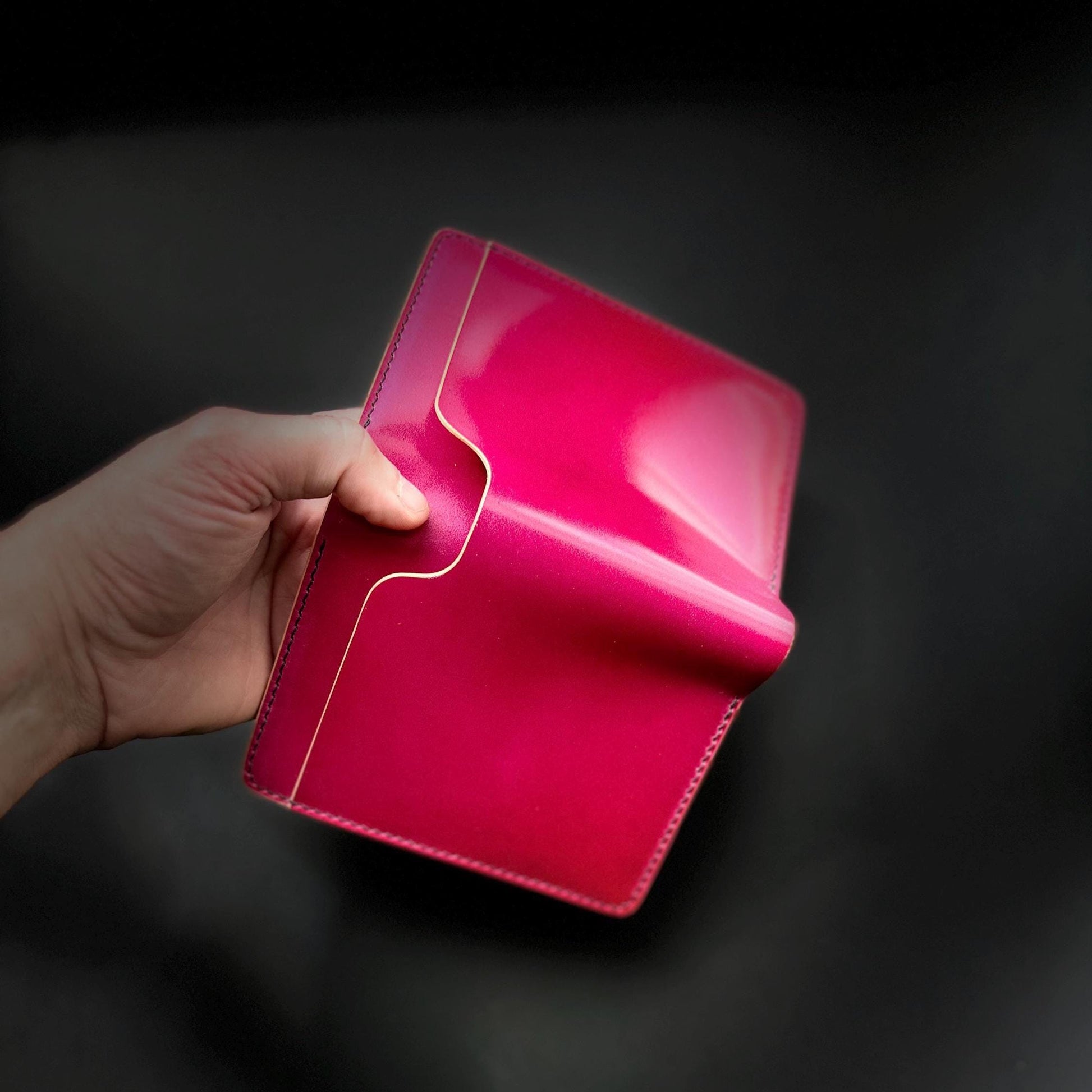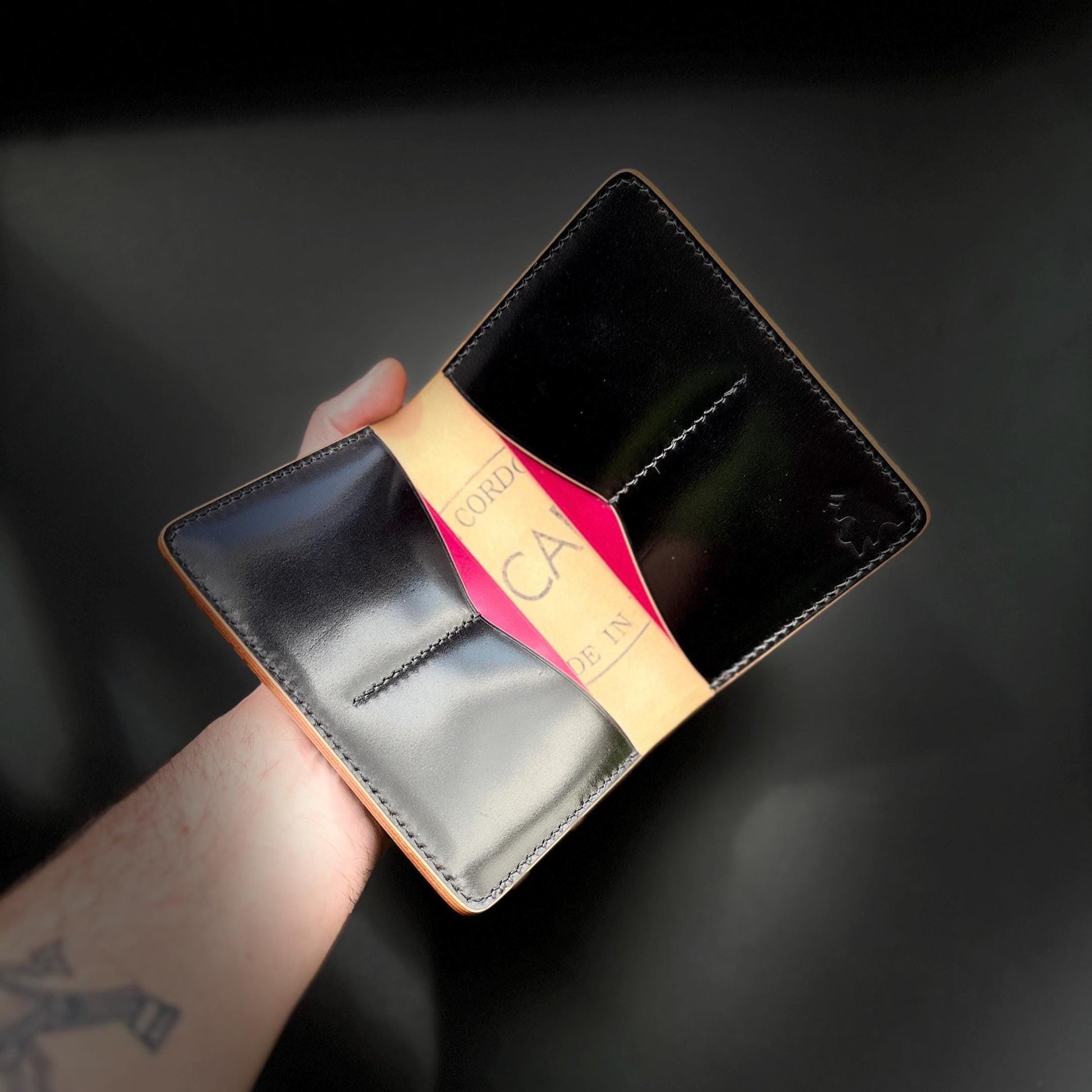 The bifold wallet is made of solid pink Shell Cordovan leather and solid black Shell Cordovan leather from the Italian factory Rocado and stitched with handmade purple thread.