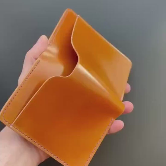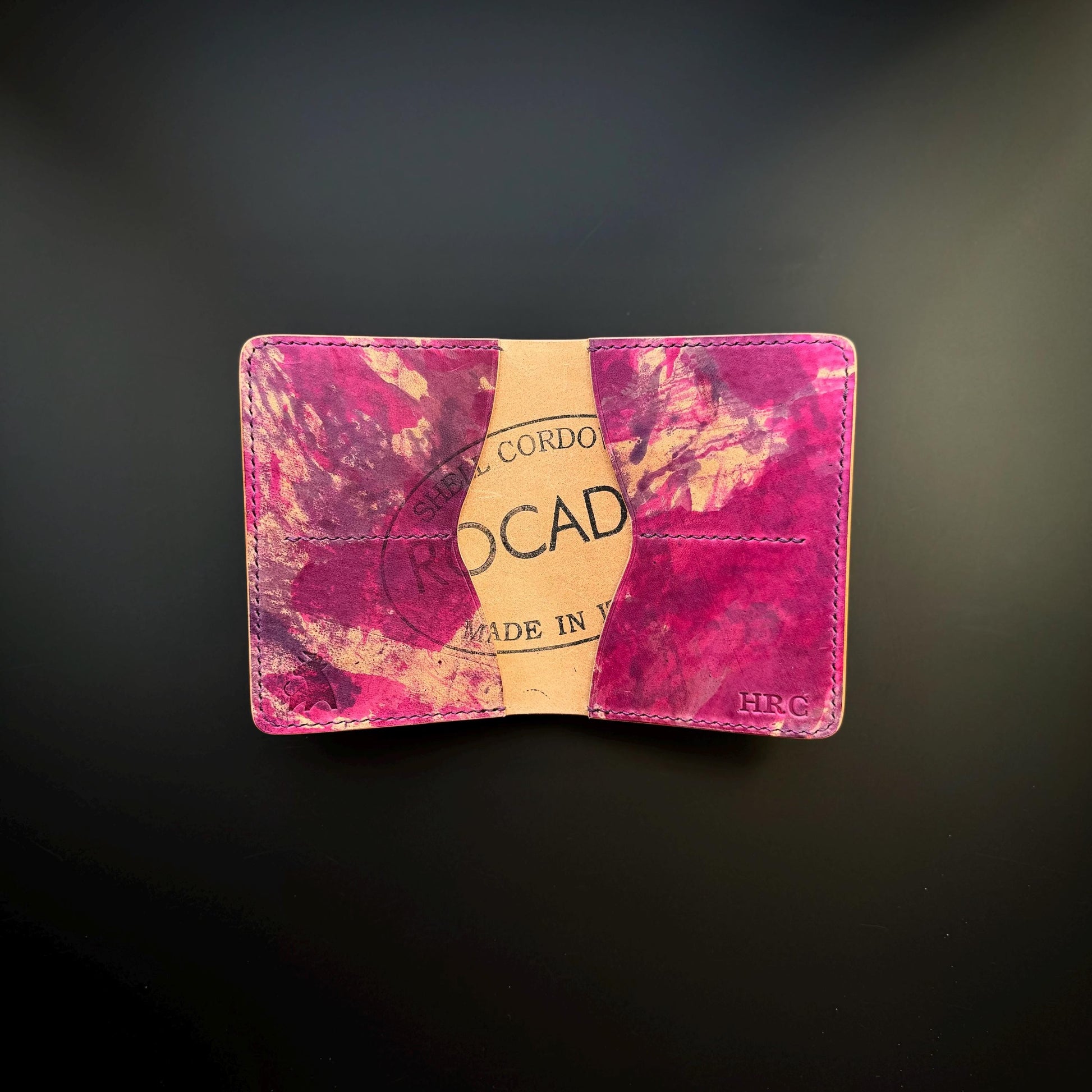 The bifold wallet is made of solid whiskey and marbled purple reverse Shell Cordovan leather from the Italian factory Rocado.