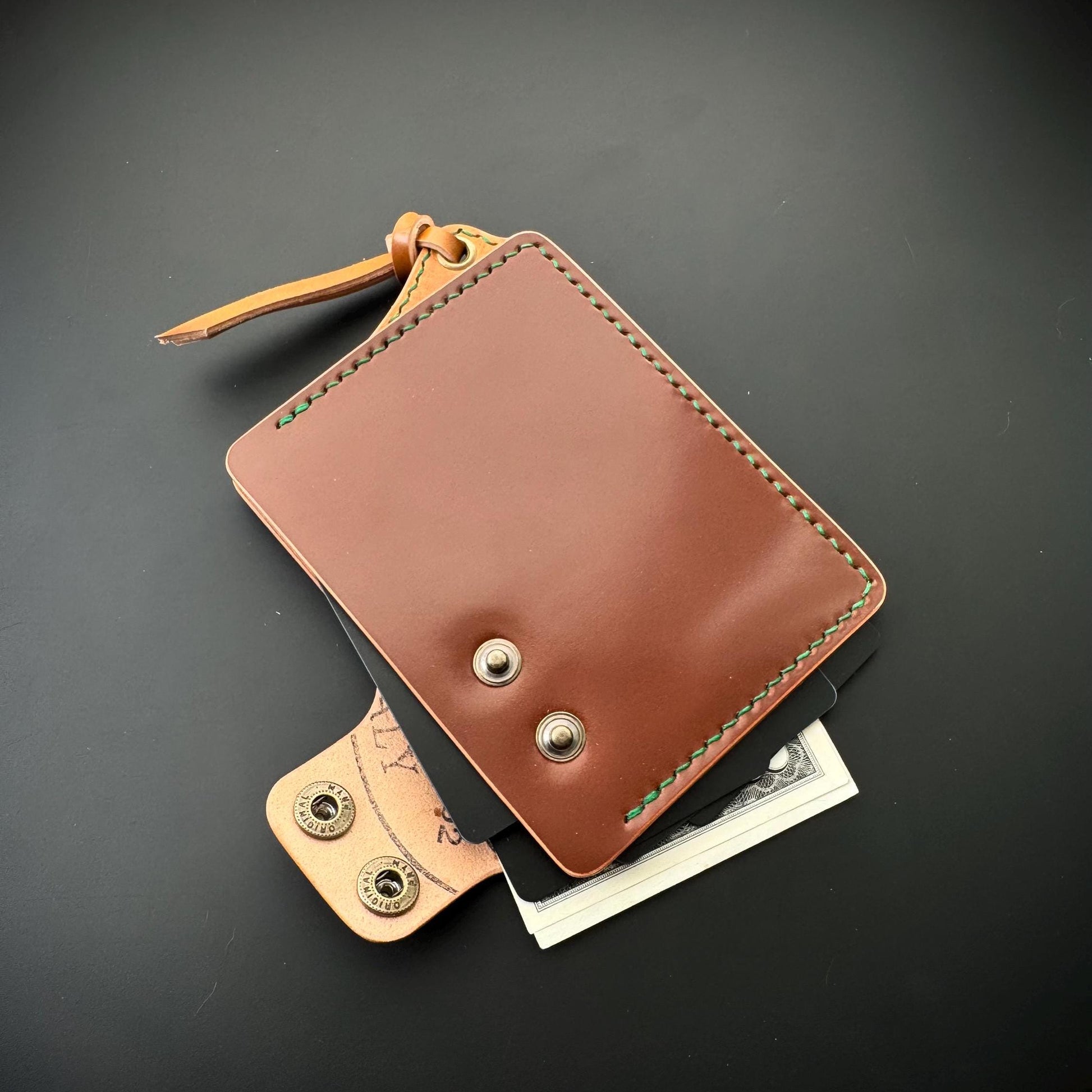 This leather card wallet is made from cordovan leather, which is a type of leather made from horsehide. It features three separate compartments to help you organize your cash, cards, and other small items. The cordovan leather is known for its durability, making this wallet a long-lasting choice. The wallet's shell cordovan leather is also characterized by its unique glossy and smooth finish that improves with age, giving it an even more distinguished and polished look over time. This shell cordovan wallet is an excellent option for anyone looking for a stylish and practical accessory that can stand the test of time.