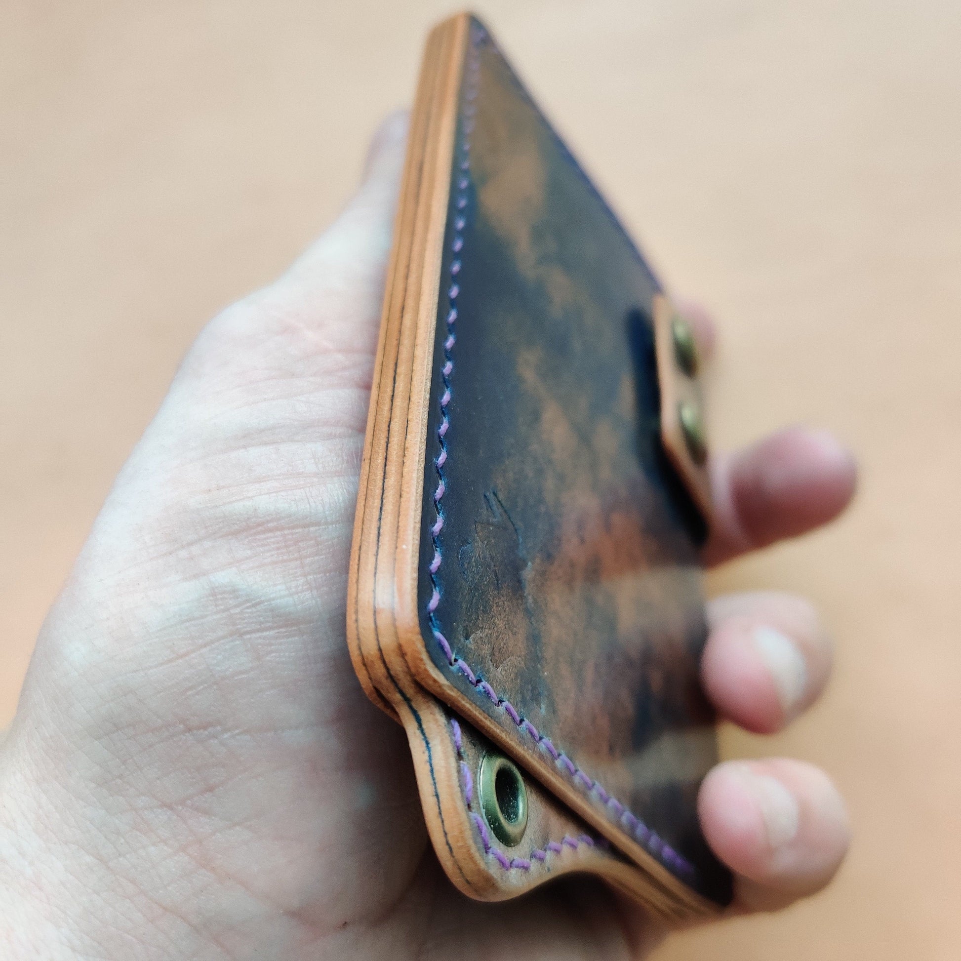 The edge of the wallet is sanded and polished by hand to a shine!