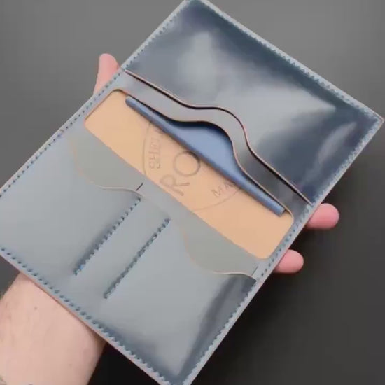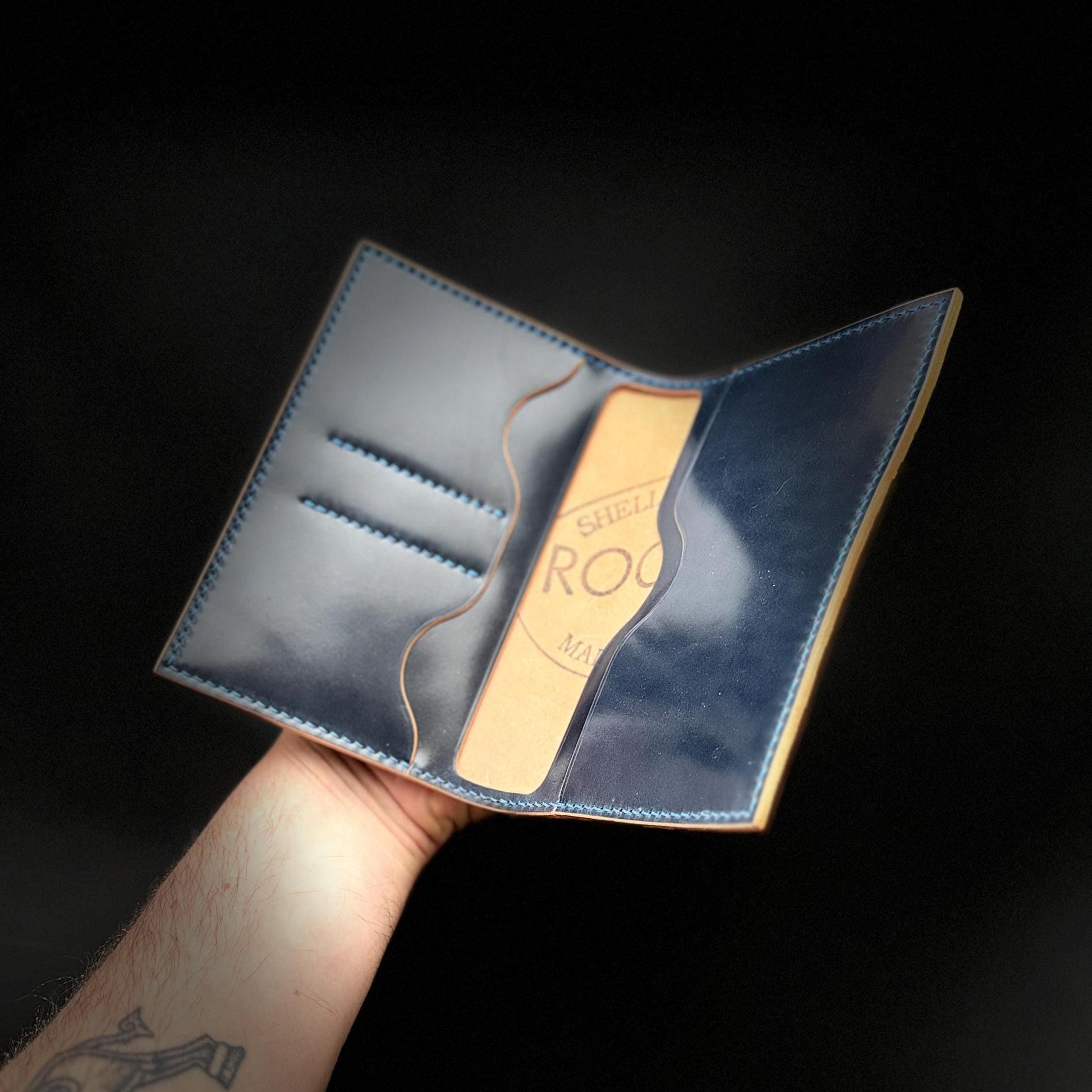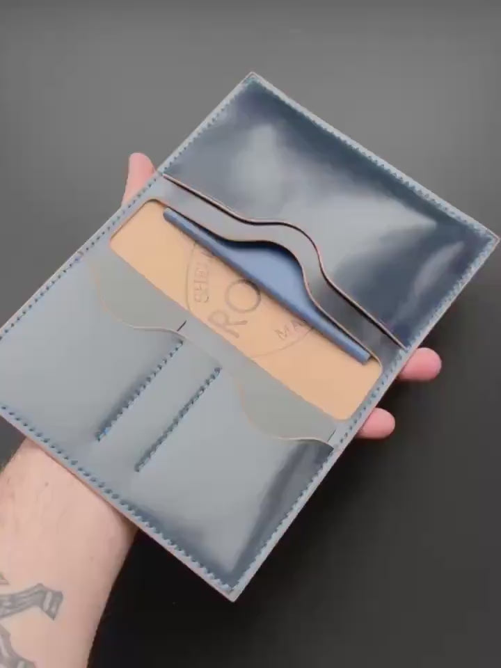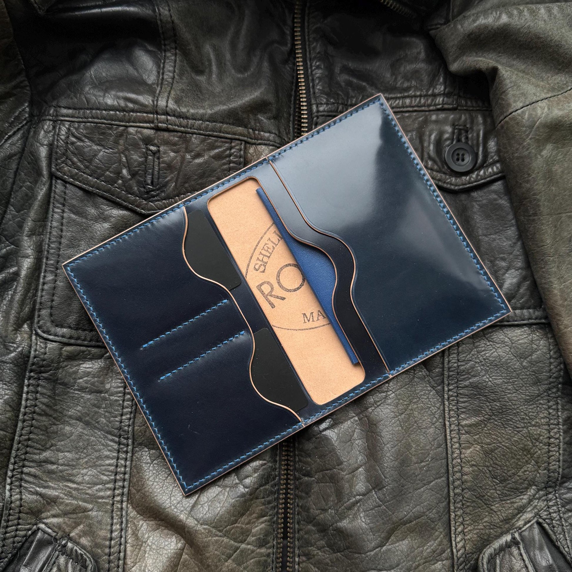 Introducing a meticulously crafted document holder, handmade from exquisite blue Rocado Shell Cordovan leather. This document holder not only serves as a practical accessory but also as a testament to elegant design.
