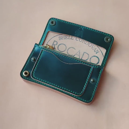 This exquisite mini trucker wallet is crafted from Rocado Shell Cordovan leather, known for its exceptional durability and luxurious texture. The wallet features a sleek and timeless design that exudes elegance.