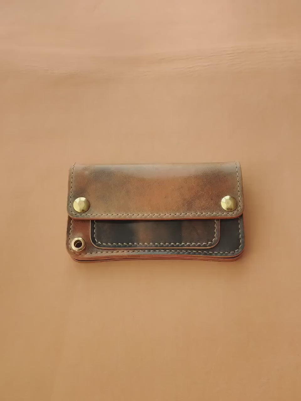 At your request, the wallet can be equipped with a brass ring for attaching a chain or a leather cord. If you need this option - just write to me about it.