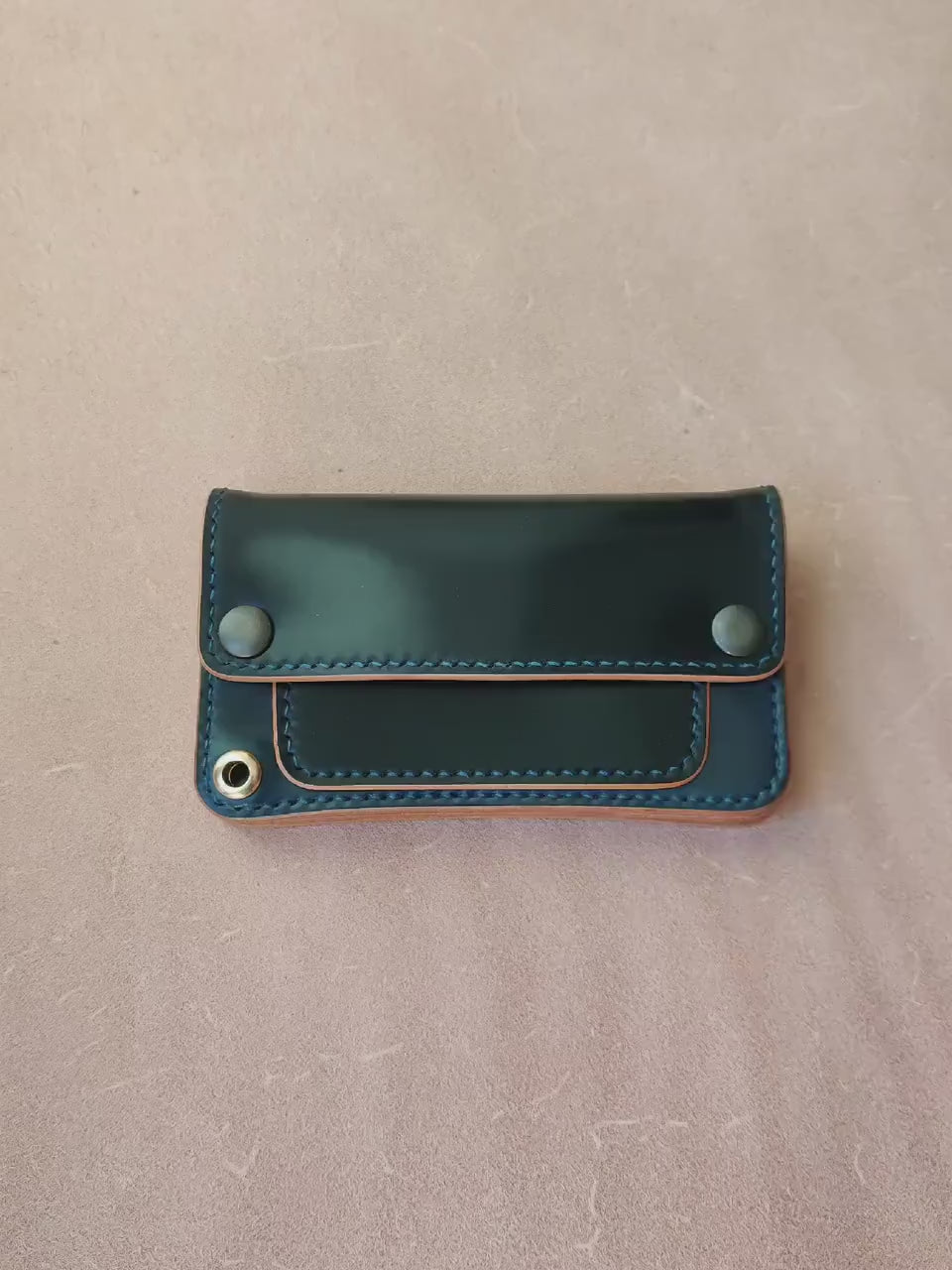 This exquisite mini trucker wallet is crafted from Rocado Shell Cordovan leather, known for its exceptional durability and luxurious texture. The wallet features a sleek and timeless design that exudes elegance.