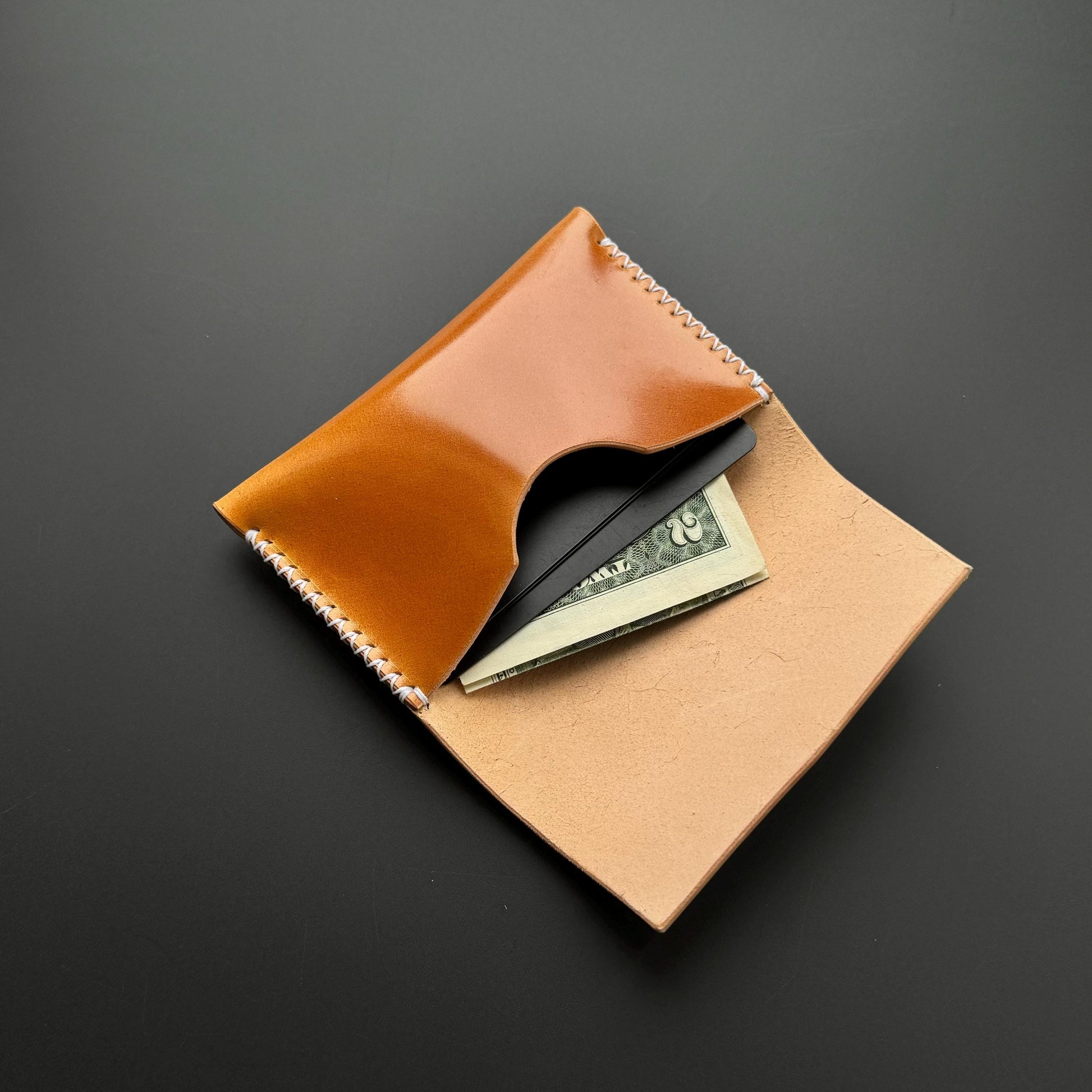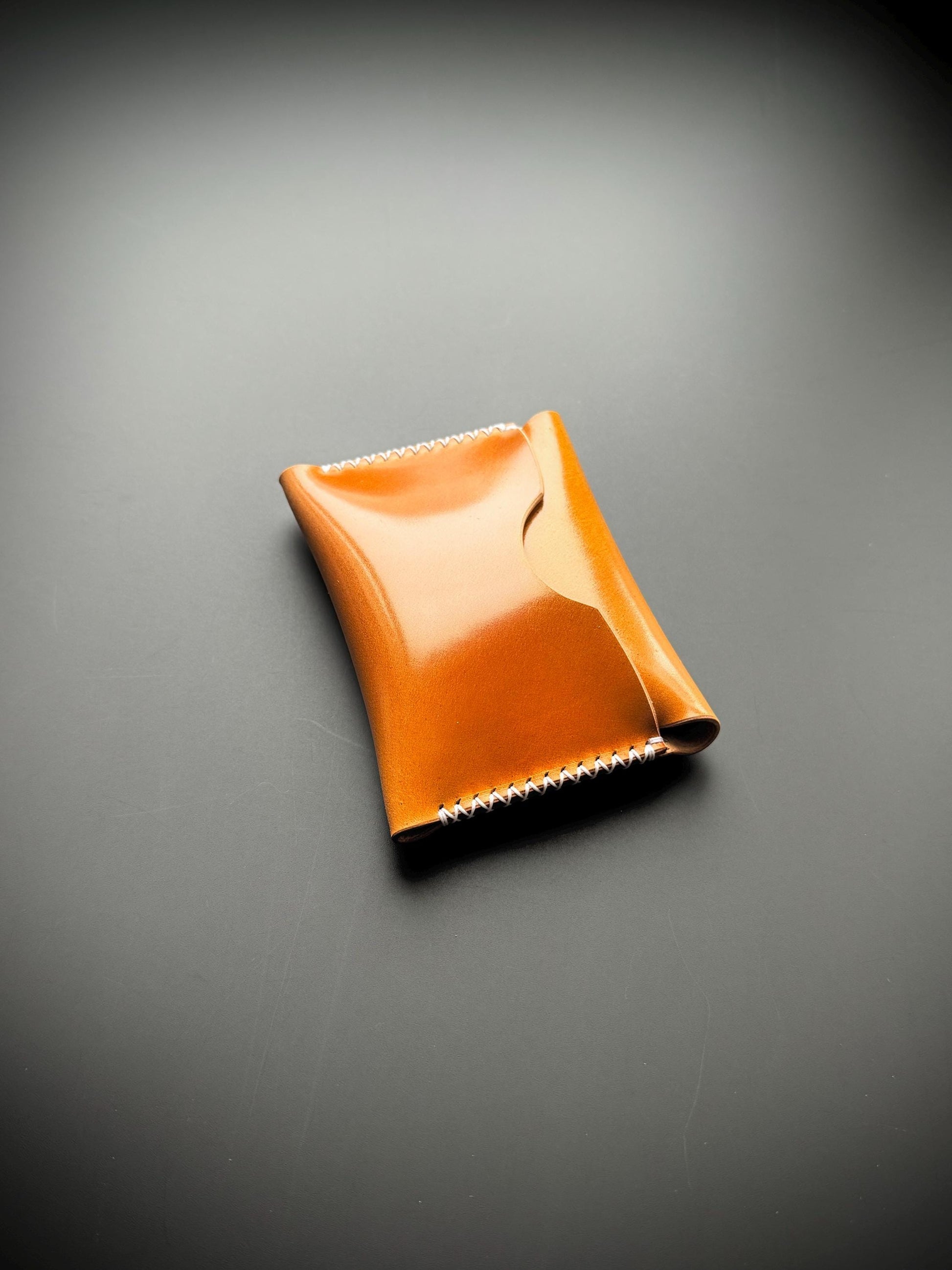 This minimalist card holder wallet made of shell cordovan is a luxurious accessory that exudes quality and style. The minimalist wallet is crafted from a single piece of leather, giving it a sleek and streamlined appearance.