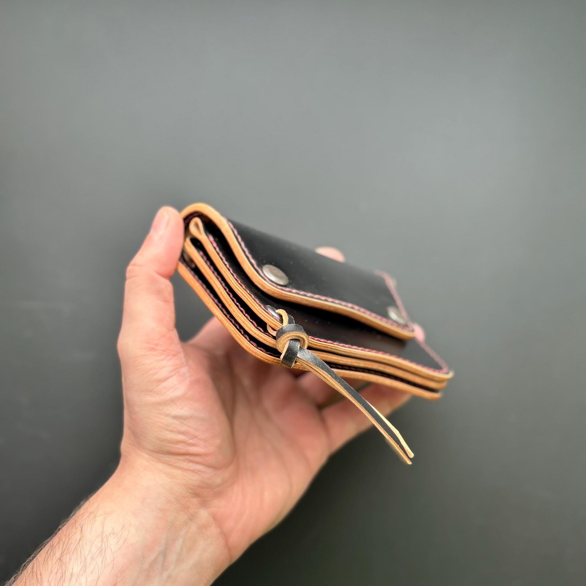Each wallet is burnished,waxed, and stamped with my signature maker's mark by hand.