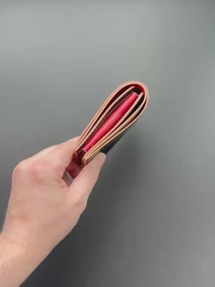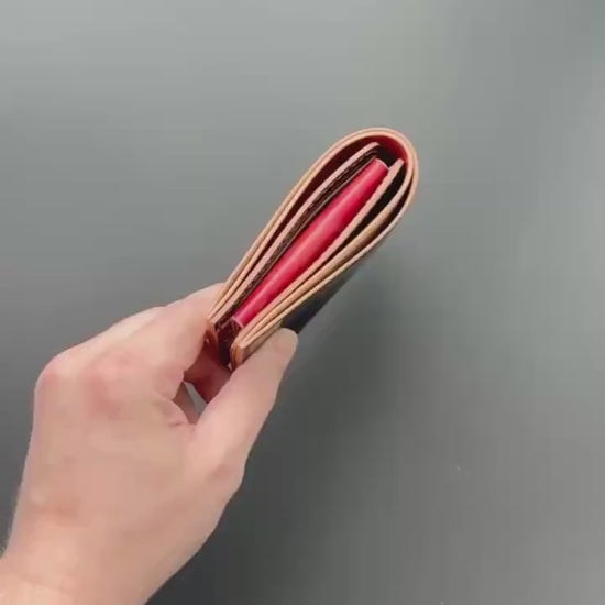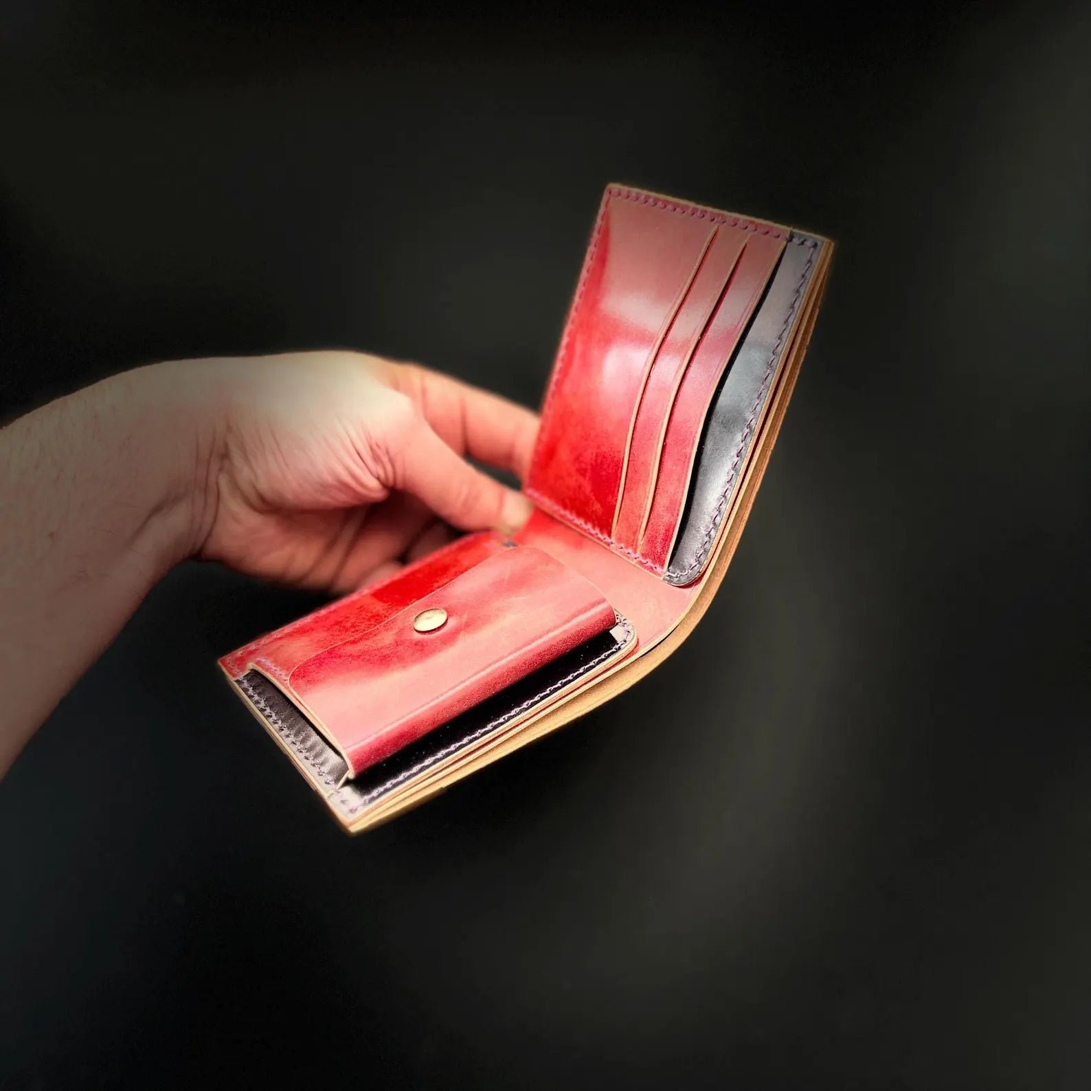 This handcrafted bifold wallet is a perfect blend of function, elegance, and premium materials. Made from luxurious Shell Cordovan by the renowned Rocado tannery, it features a bold black-and-red color combination that stands out while aging beautifully over time.