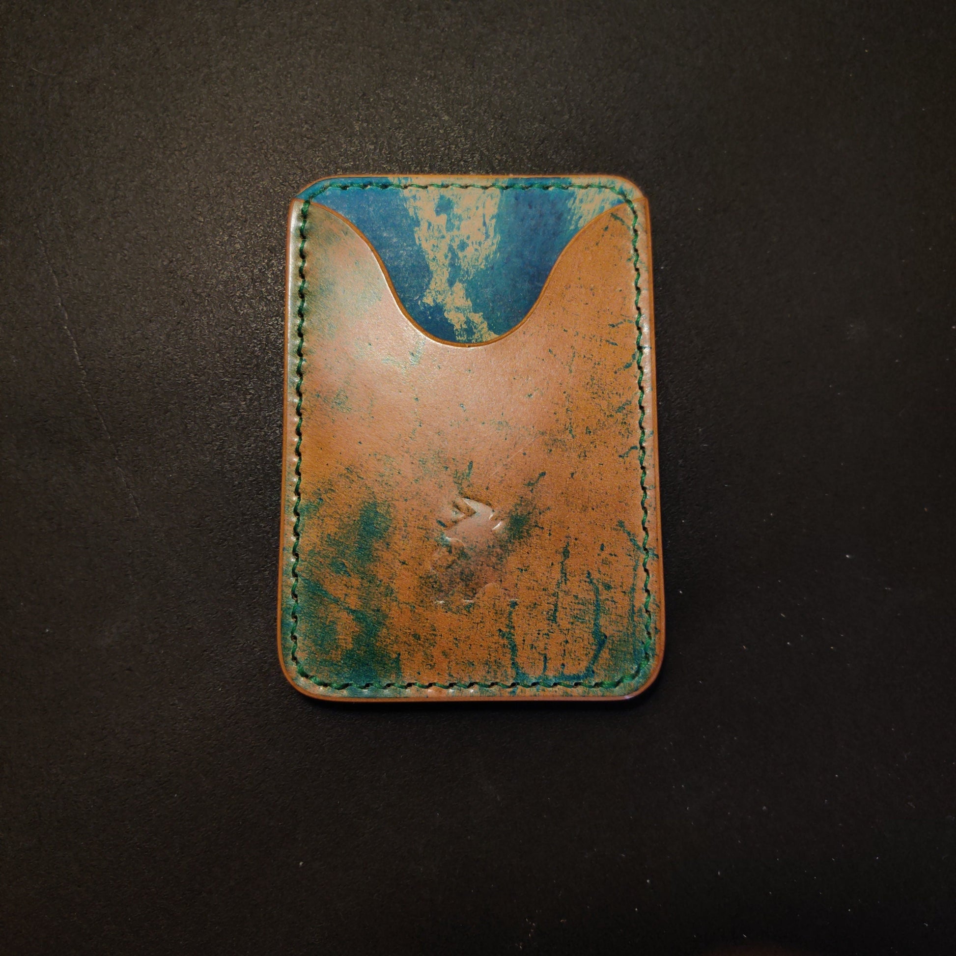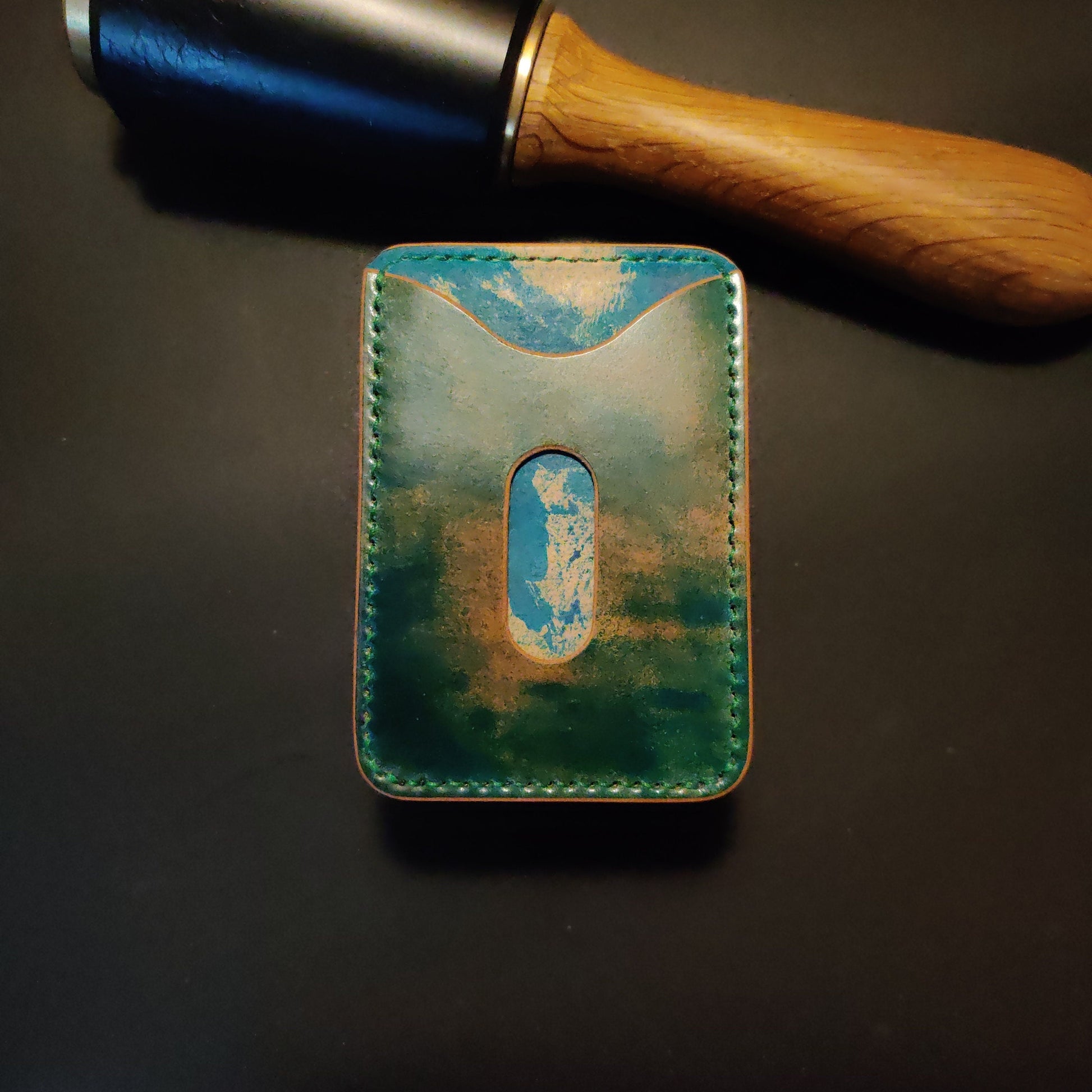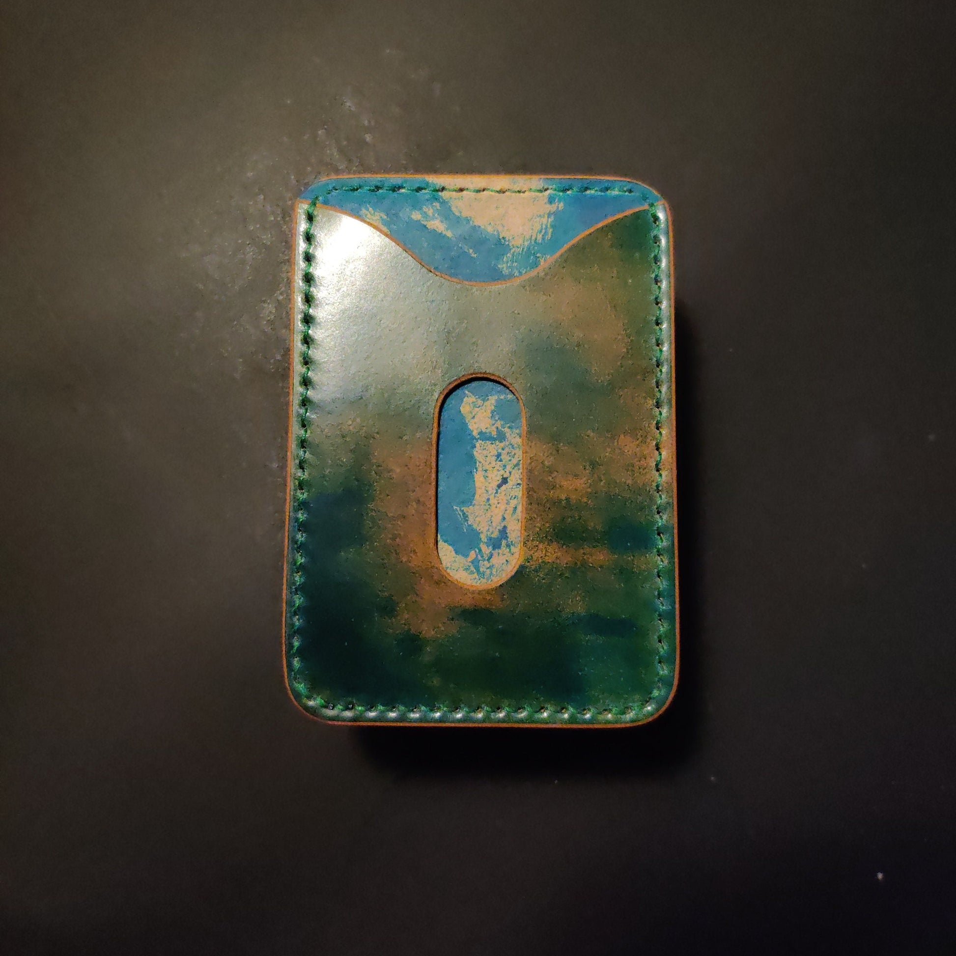 This card holder wallet would also make an excellent gift, made exclusively by my hands, without the use of machines, from Rocado Shell Cordovan marbled blue leather.