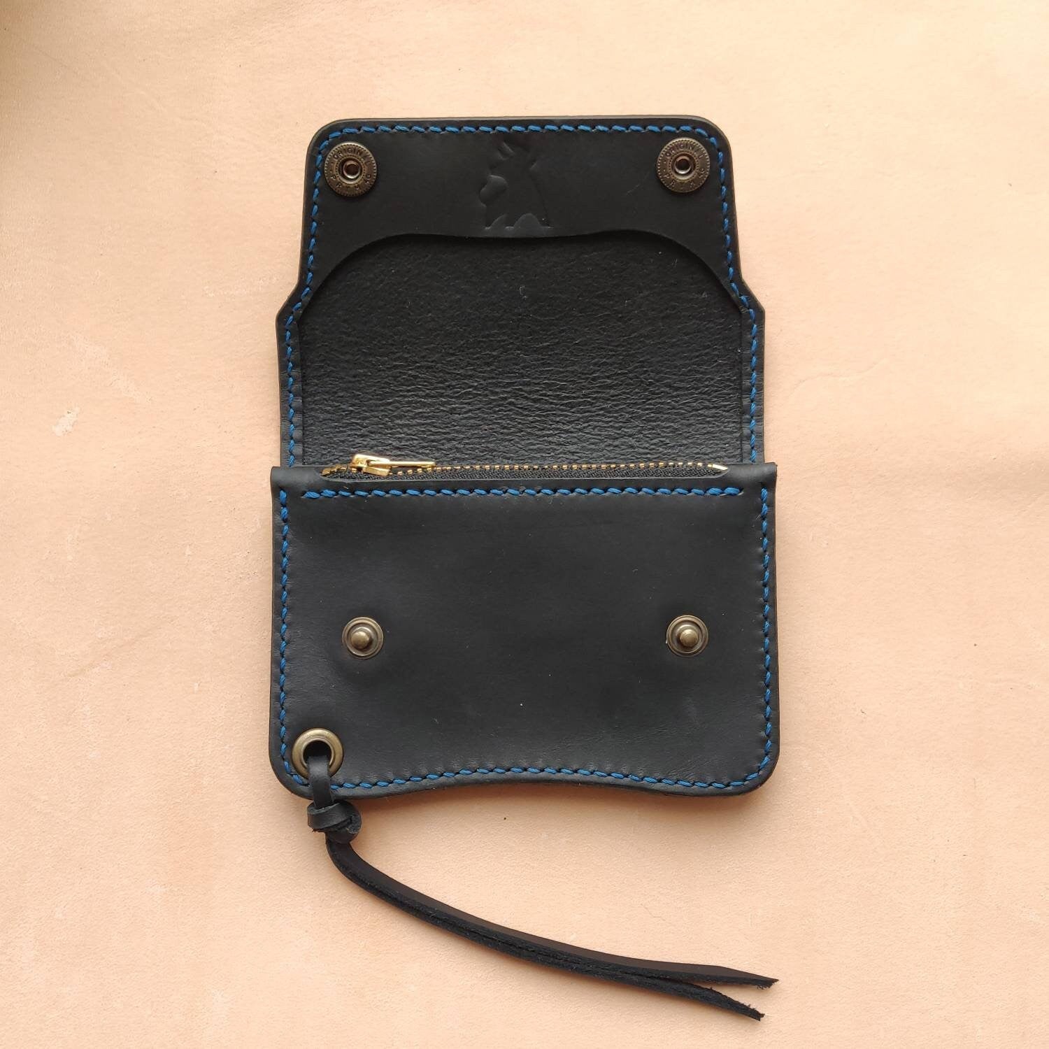 Trucker short wallet is robust in feel. Each wallet is burnished,waxed, and stamped with my signature maker's mark by hand.